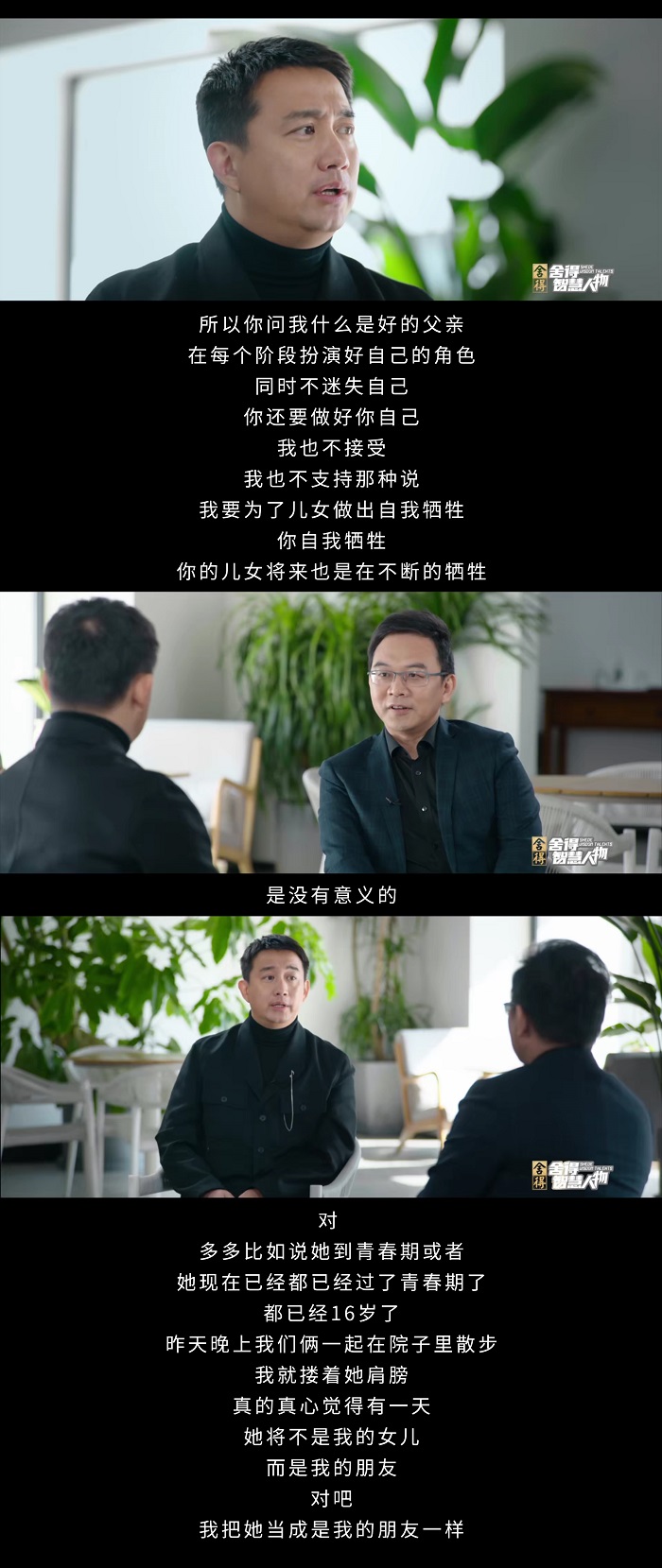 黄磊是一个重视家庭的人。拍摄电视剧时,他会尽量促成在北京拍摄,这样晚上就可以回家陪伴家人。黄磊的大女儿多多已经16岁了,今年多多今年过生日时,黄磊和妻子帮她和同学订了餐厅,却不干涉孩子们的聚会。多多过两年也要上大学,黄磊知道孩子的生活开始与自己越来越无关,但他认为父母应该学会接受。“所以你问我什么是好的父亲,在每个阶段扮演好自己的角色,同时不迷失自己,你还要做好你自己。我也不支持那种说我要为了儿女做出自我牺牲,你自我牺牲,你的儿女将来也是在不断的牺牲”。舍得是一种放手,是尊重孩子独立生活的能力,也是尊重父母做自己的品格;舍得是爱的能力,放手后孩子和父母才能够彼此成长。