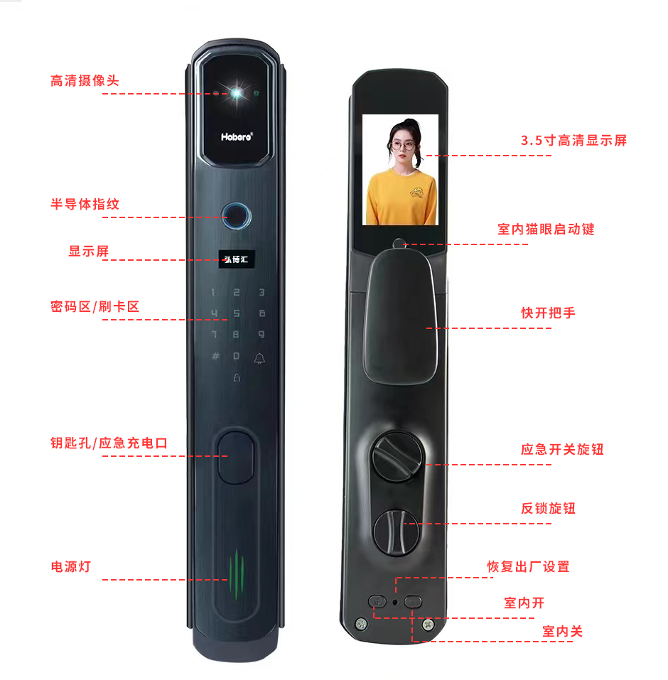 弘博汇F10D智能锁,超大广角猫眼,搭配夜视补光,随时可见门外动态,无惧白天黑夜!再配合3.5寸高清屏,让监控视线更广更清晰,老人,小孩在家,安全安心!