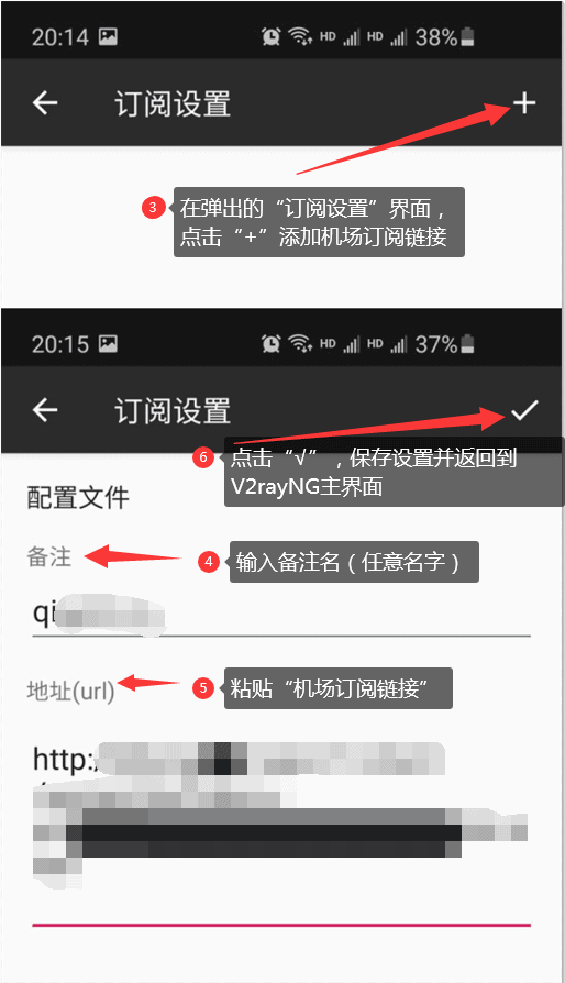 3、接下来单击”+“号,把机场链接添加到订阅,详细操作图如下: