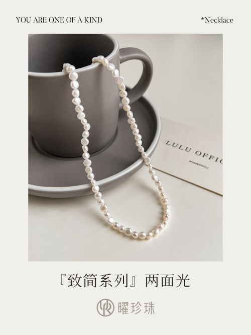 【致简系列】两面光项链每一颗珍珠都自然盈透,虽说是异形珠,但每颗都有着恰到好处的莹润和透亮,当阳光照射到项链上时,形态不一的外形与斑斓光彩相得益彰,为莹莹夏日增添一抹活力。