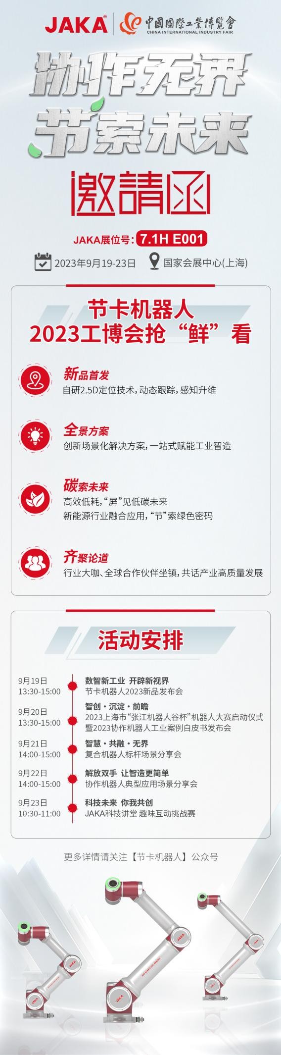 这款应用有哪些技术亮点和设计细节?9月19-23日,欢迎您莅临2023中国工博会节卡机器人展台一探究竟。现场还可解锁更多节卡机器人在新工业、新商业领域的解决方案和绿色成果。