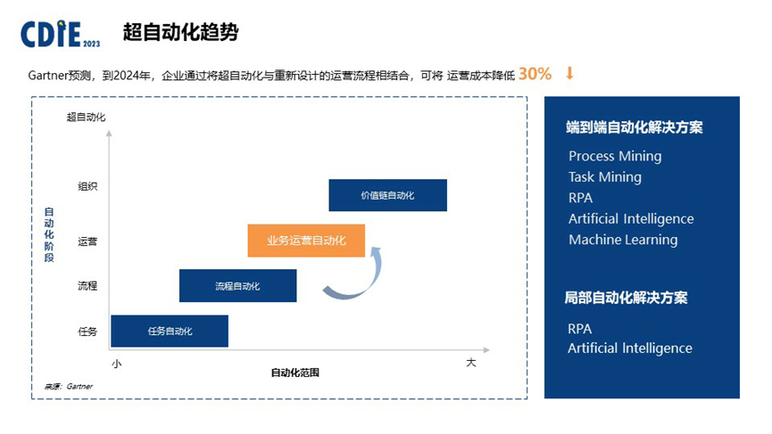 Gartner预测,到2024年,企业通过将超自动化与重新设计的运营流程相结合,可将运营成本降低约30%。