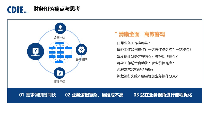 目前,RPA主要用于解决业务流程中某些场景的具体操作,但企业需要更广阔的视角,站在整个端到端流程的角度去发现流程中需要优化的切入点,进而实现整体流程的提效和提质,而不仅仅是局部的改进。
