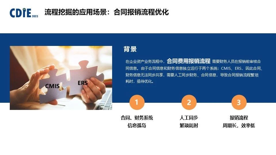 流程挖掘有这么多作用,具体实践中如何操作呢?接下来吴鑫列举了流程挖掘在中石化“合同报销流程”中的应用为我们进行了演示和介绍。