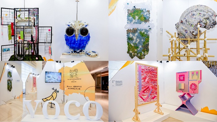 “妙趣重生”青年艺术家驻留计划由voco品牌携手东华智库文化创意产业研究院及WeArt联合发起,五位合作的艺术家分别为:俞文杰、叶帆、欧阳苏龙、张艺菡、E5文斌。艺术家们以“未来,新生,空间,时间,碎片”为创作主题,并利用生活中随处可见的废旧物品:旧物编织、回收亚克力生产剩余材料、回收旧报纸、天然橡胶气球再生材料、塑料空瓶,解构重组进行艺术作品创作以诠释环保理念,鼓励和引领大众共同关注环保。宾客可藉由该艺术展所呈现的多元感官体验和环保艺术美学,激发对绿色生活方式的兴趣。