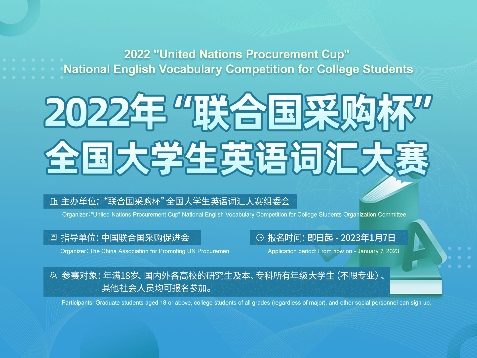 贯彻落实民政部、教育部、人力资源社会保障部印发的《关于推动社会组织进一步助力高校毕业生等群体就业工作的通知》的文件精神,在国内外有关单位支持下,中国联合国采购促进会牵头组织经过了数月的筹备,“2022联合国采购杯全国大学生英语词汇大赛”现在正式启动并接受国内外高校大学生报名