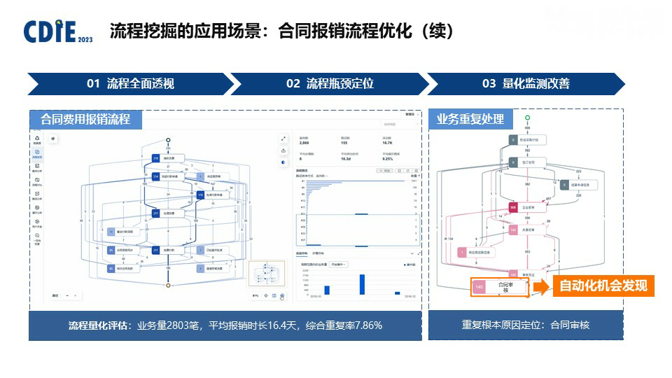 流程挖掘有这么多作用,具体实践中如何操作呢?接下来吴鑫列举了流程挖掘在中石化“合同报销流程”中的应用为我们进行了演示和介绍。