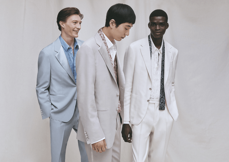 聚焦白色亚麻套装或丝绸晚宴西装外套,悦目于温雅色调,沉浸于地中海仲夏之夜。淡紫色丝绸枪领、双排扣燕尾服,配以亚麻薄纱荷叶边衬衫、修身长裤和同色调的晚装便鞋,引发轻盈遐想,彰显雅致绅影。