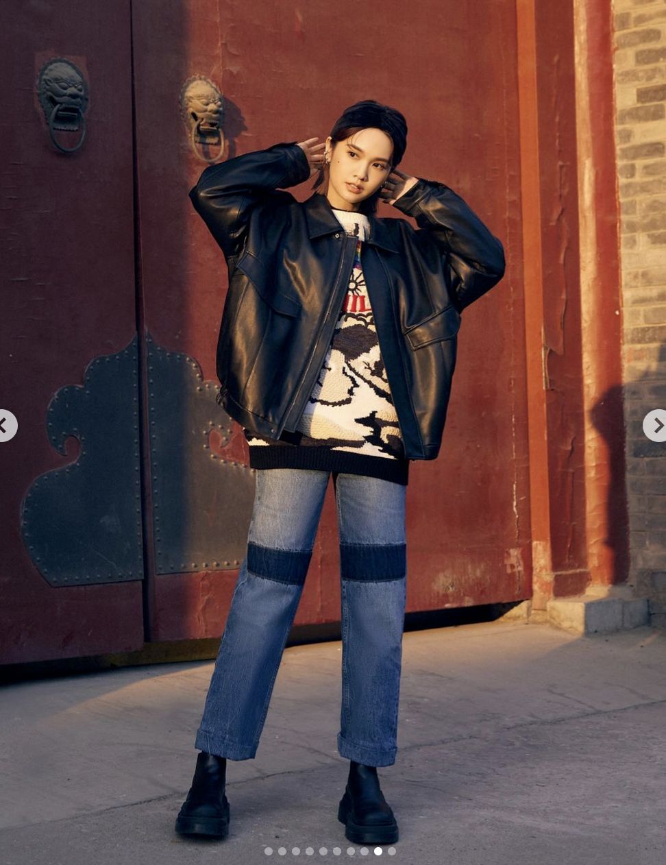 ▲杨丞琳以干练的皮革外套搭配蓝色拼接牛仔裤 。(图/品牌提供、翻摄自IG)